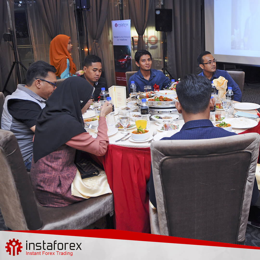 Tetamu untuk Majlis Makan Malam Pedagang Instaforex Kedah menikmati hidangan yang terbaik, dirangkaikan, dan dapat berkongsi idea, berita dan rahsia dalam perdagangan. Semua tetamu dalam acara ini mempunyai minat yang sama — iaitu dalam pasaran pertukaran mata wang asing - supaya mereka mempunyai banyak topik dan cerita untuk dibualkan. Selain itu, para tetamu pada malam itu juga dihargai dengan ucapan Guru forex Muhammad Bin Nordin. Beliau membentangkan kajian menyeluruh tentang analisis teknikal dan berkongsi pengalaman yang terkumpul dan pengetahuannya yang luas, semasa bertahun-tahun kerja dalam bidang kewangan.