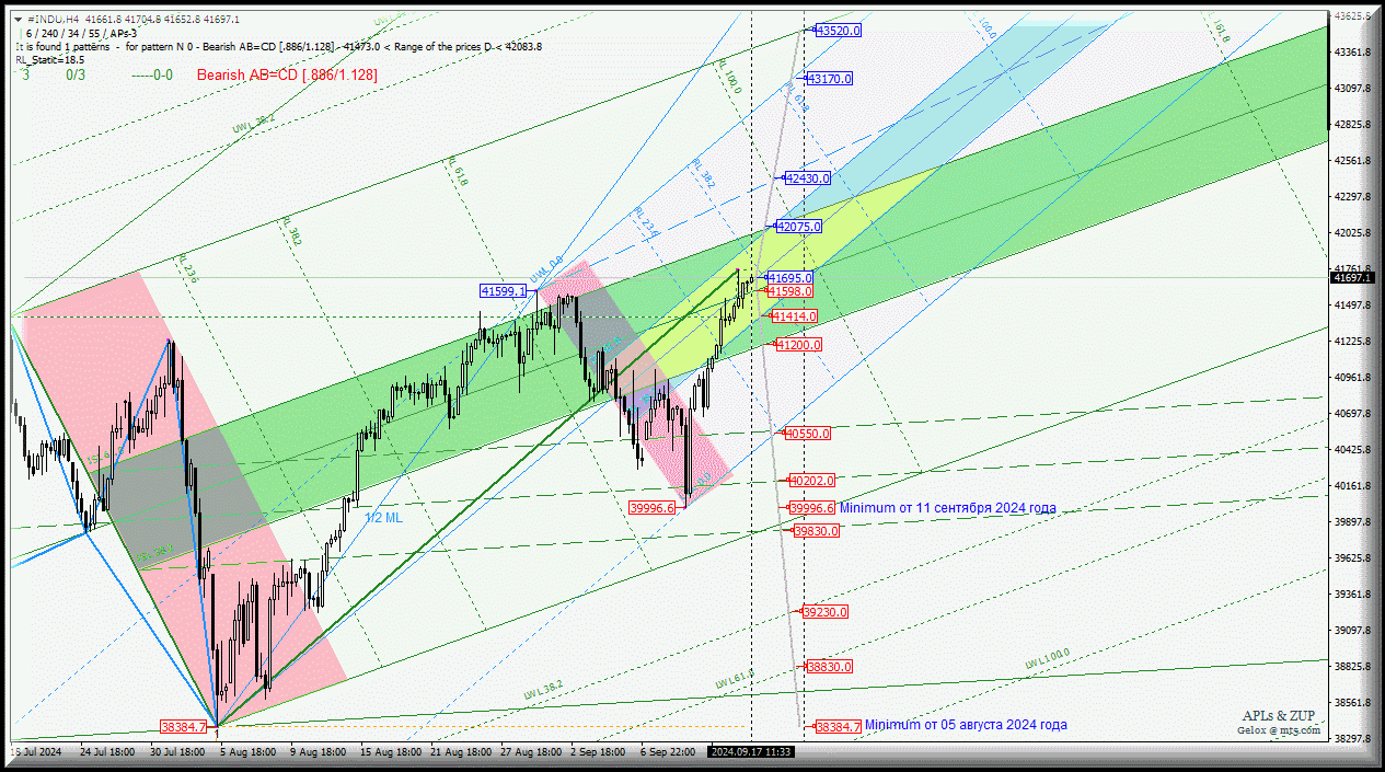 #INDU - Dow Jones Industrial Average - h4 - продолжим рост на слабом долларе? Комплексный анализ (с анимационной разметкой) - вилы Эндрюса APLs & ZUP - с 17 сентября 2024
