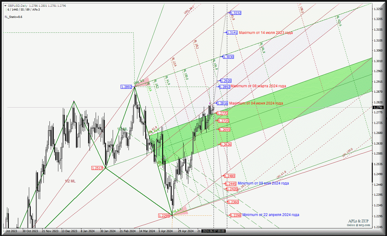В случае же, если будет пробит уровень сопротивления 1.2816 (maximum от 04 июня 2024 года) на срединной линии Median Line Minor-Daily Great Britain Pound vs US Dollar продолжит свое движение к целям: