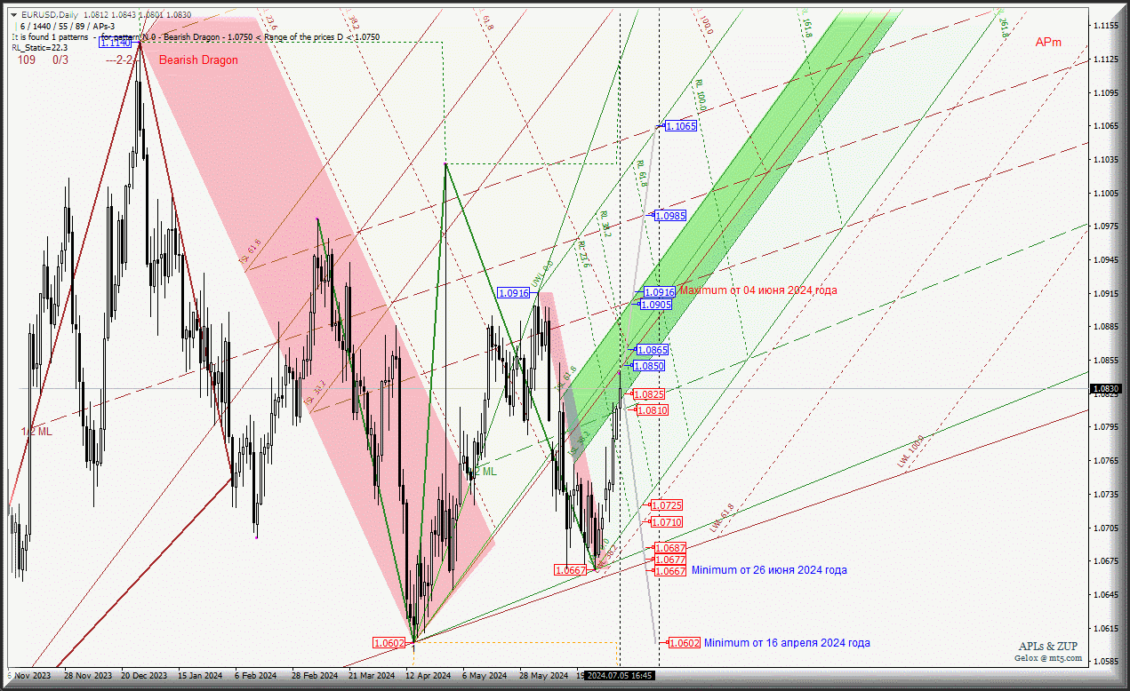 Euro vs US Dollar - рост выше 1.0850 маловероятен? Комплексный анализ (с анимационной разметкой) - APLs & ZUP - с 08 июля 2024 года