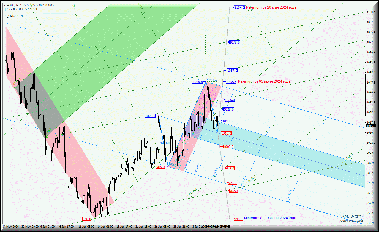 С 10 июля 2024 года развитие движения #PLF будет обусловлено отработкой и направлением пробоя границ зоны равновесия (1019.0 - 1010.0 - 1000.0) вил младшего операционного масштаба Minuette-h1.