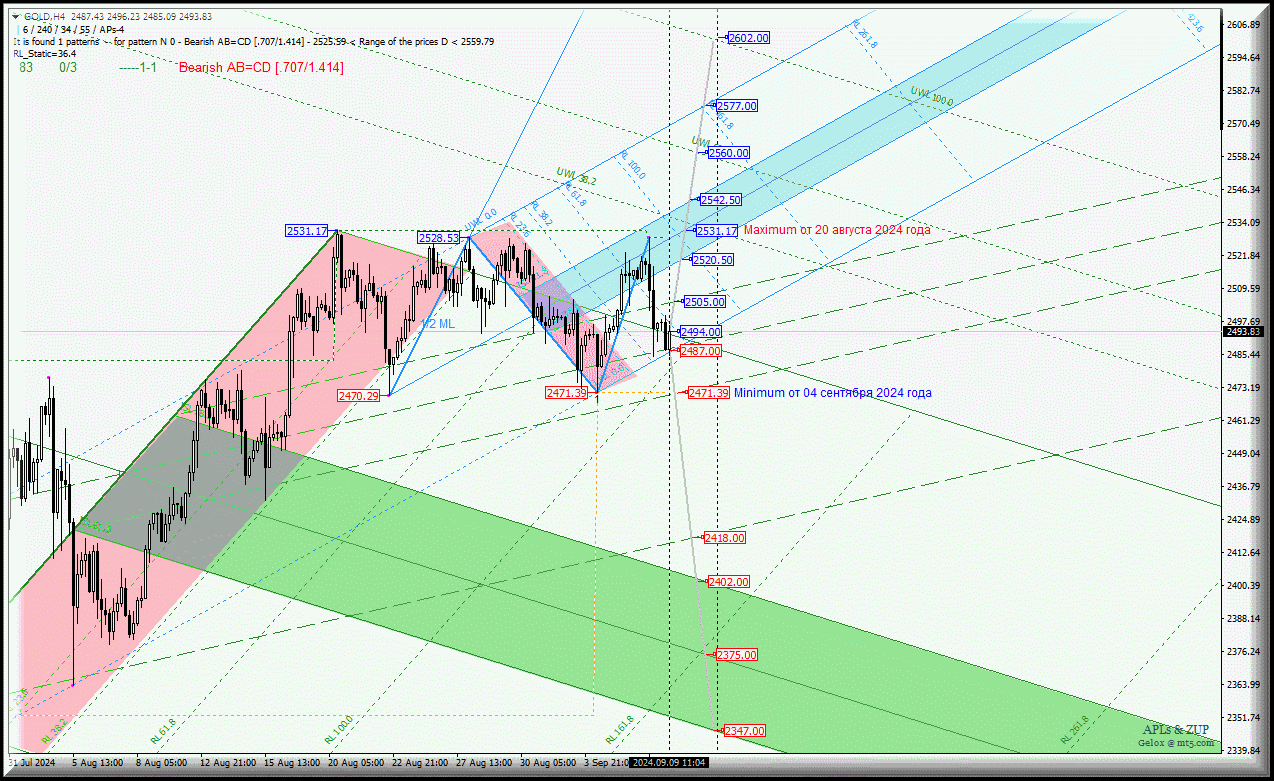 С 10 сентября 2024 года развитие движения Spot Gold-h4 будет обусловлено отработкой и направлением пробоя границ канала 1/2 Median Line (2489.00 - 2497.00 - 2504.00) вил старшего операционного масштаба Minute-h4 и продолжится исходя из направления пробоя диапазона: